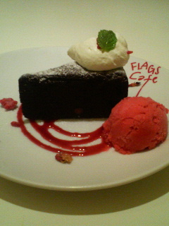 お昼ごはん、アイスクリームだけだったので、 お腹がすいて、5時には夕食食べちゃった! パスタとパニーニを食べたんだけど、 まだ足りなくて、 デザート頼んだよ☆ ケーキにまたまたアイスクリーム! ガトーショコラと木苺のソルベです☆